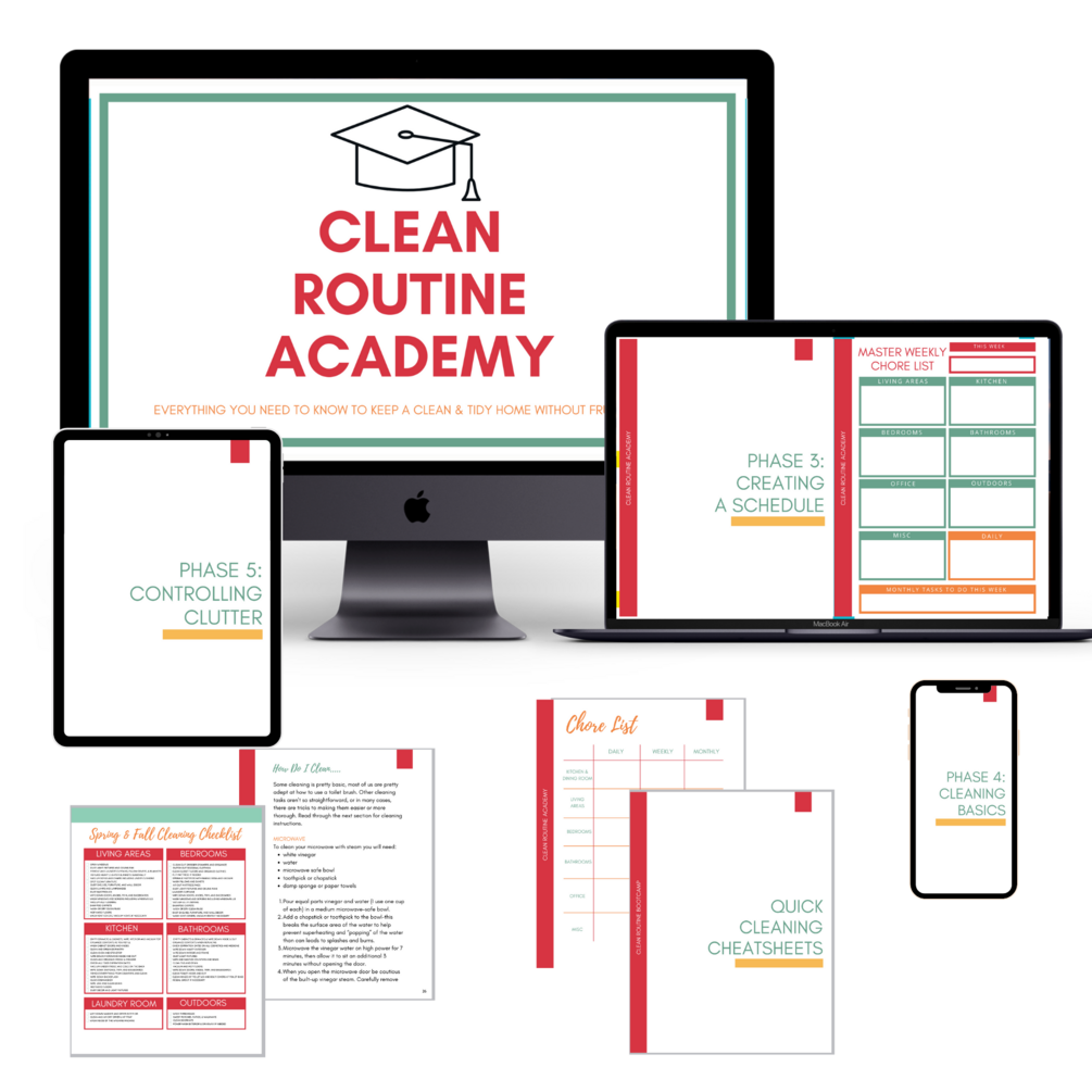 50+ page Clean Routine Academy workbook including pre-filled and blank cleaning schedules to customize for your home, & 13 step-by-step tutorials for cleaning challenging areas of your home.